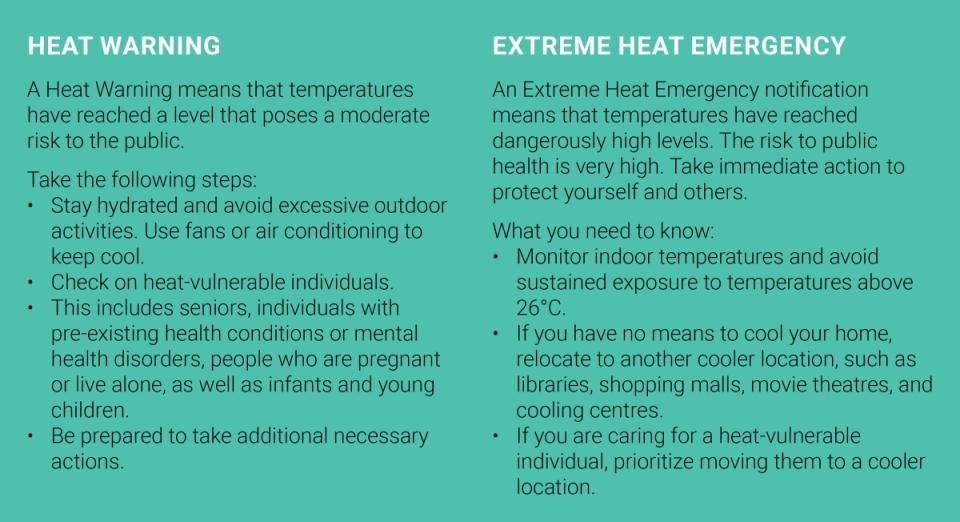 B.C. has two levels of heat alerts: Heat Warnings and Extreme Heat Emergencies.