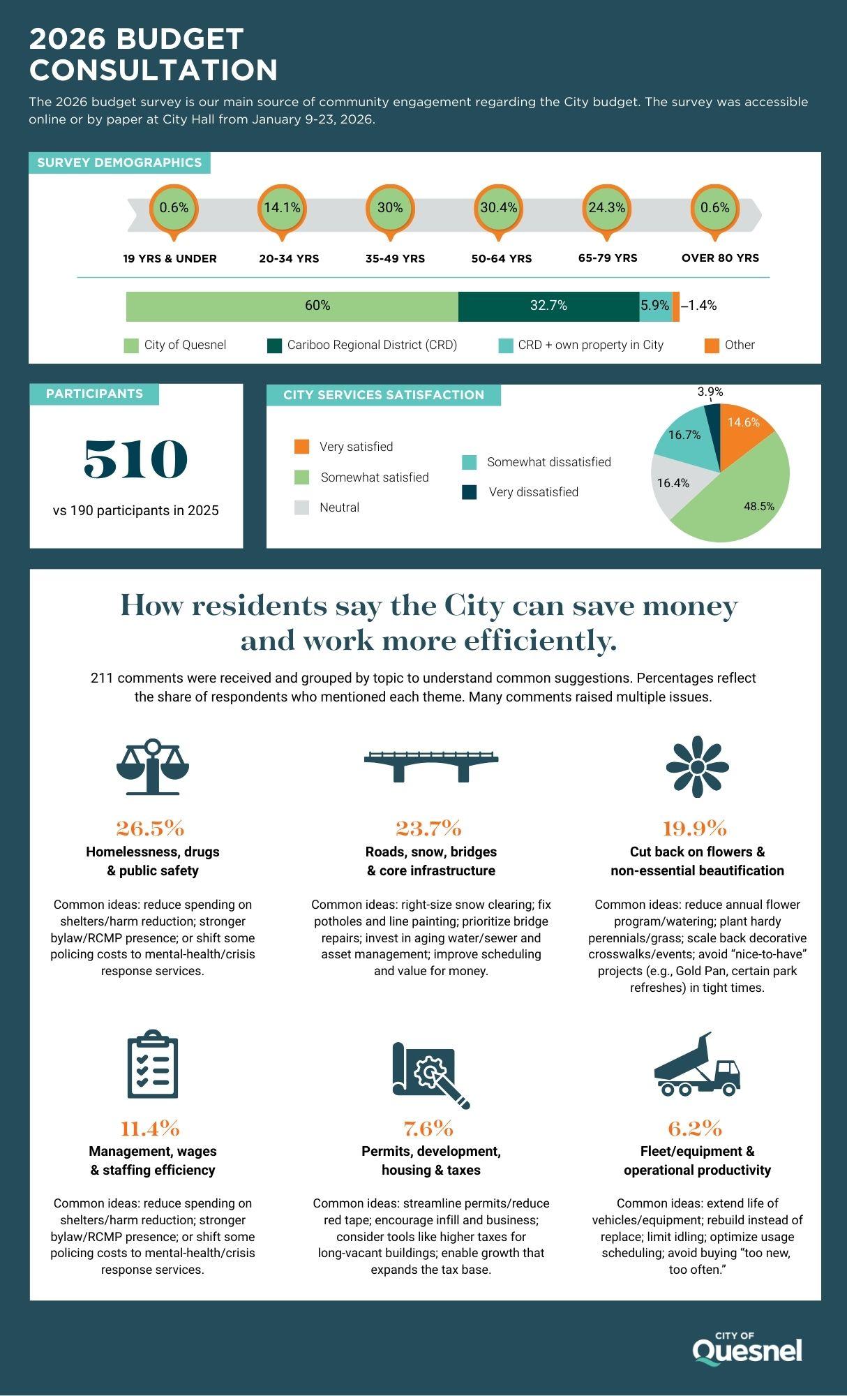 The City welcomes comments about the budget throughout the year! Send your comments to budget@quesnel.ca.