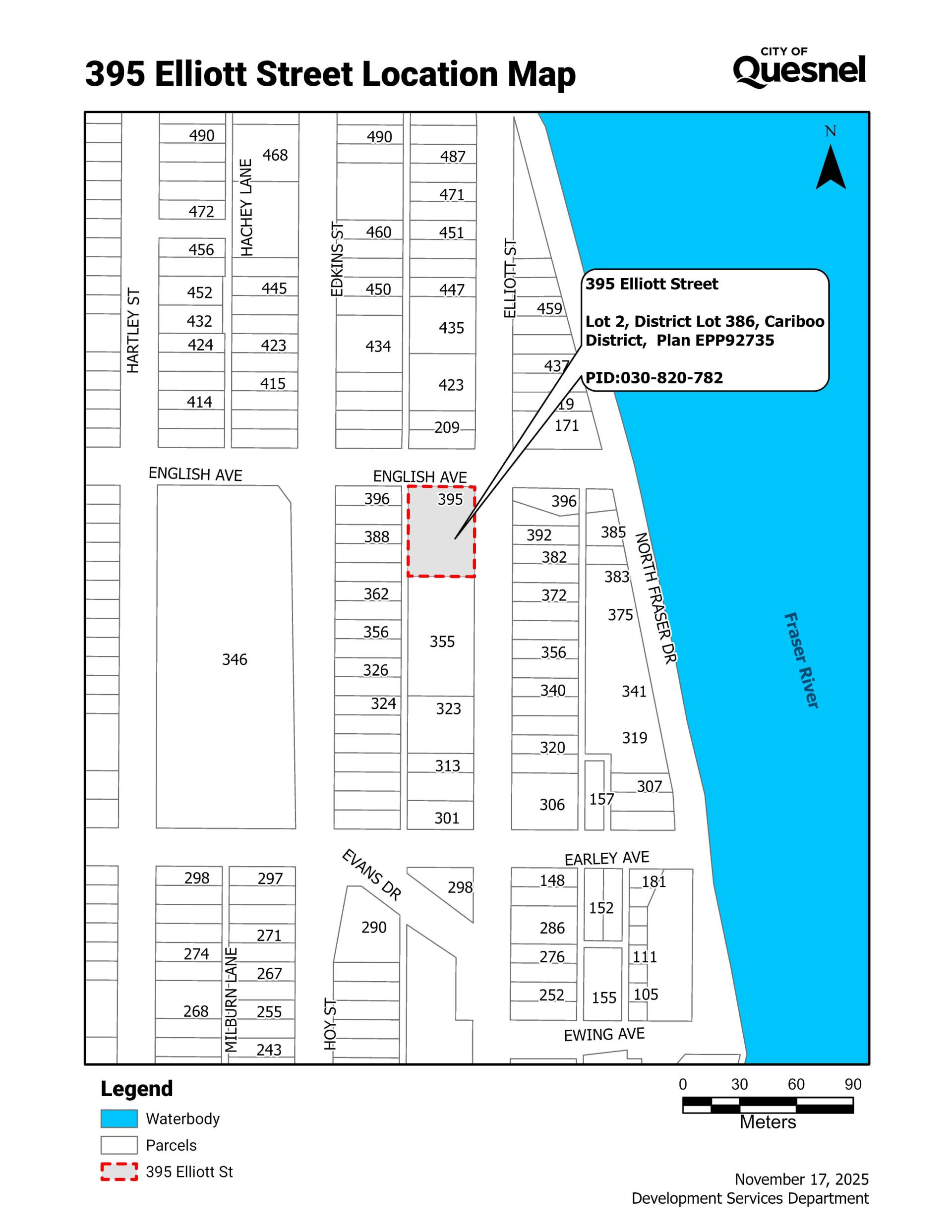 Written submissions regarding the proposed application may be submitted to City Hall in person or by email to developmentservices@quesnel.ca no later than 12:00 pm, Tuesday, December 23, 2025. Email submissions must include subject 395 Elliott Street, and full name and address of submitter.